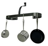 Enclume premier pot rack. Features oval shape and wall mounting. Measures 27- inch x 8.5- inch x 16- inch.