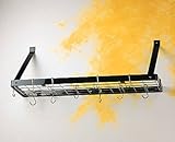 The bookshelf/wall-mount pot rack is for kitchens with no space for a hanging pot rack overhead. Hang pans from the rack and place cookbooks and other items on the shelf. In black with chrome accessories, this pot rack measures 35 x 8.5 x 13-in. high. It comes with six eye and two grid hooks. Hanging instructions are included.
