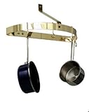 This comptemporary style rack is compact, yet deep enough to hang a large stock pot. Ample storage space remains for more cookware. Made of strong steel with a wonderful brass finish. Includes mounting hardware and 6 angled hooks.