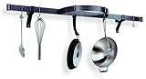The half circle design provides the depth needed to hang large pots, while the long bar has ample space for all your utensils and cookware. Wall brackets adjust for easy mounting plus can accommodate standard 1" x 4" shelving (not included) to hold supplies. Includes 4-inch wall brackets and 12 angled pot hooks, plus drywall toggles. Utensils and pots not included