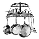 Break away from the mold with the 2-Shelf Wall Mount Black Pot Rack. This unique pot rack has a double-shelf design and unlike traditional racks that hang from the ceiling this one mounts directly to the wall making it great for spaces with high or vaulted ceilings. This metal rack features a contemporary black finish that looks beautiful next to any cookware. Your pans can hang with S hooks along the rail larger items and pot lids rest easily on either of the two shelves. This rack holds up to 40 pounds and includes all of the necessary mounting hardware. A five-year limited household warranty is included.About Range KleenHeadquartered in Lima Ohio Range Kleen has been supplying consumers with top quality range replacement parts for over 30 years. In recent years the company has expanded their line to include various range accessories and kitchen cookware and they are well known for their attention to detail use of superior materials and high quality craftsmanship. Range Kleen holds the #1 brand ranking in range accessories and has held that position since 1992. After trying their cookware we think you'll understand why.