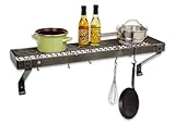 A big hit from the moment we introduced them, these 36" racks keep your cookware, cookbooks and other necessities at your fingertips. The arms can be flipped to support rack from the bottom. Includes matching grid, 6 angled and 6 straight pot hooks plus drywall toggles. Utensils, extension hooks and pots are not included.