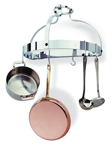 The same styling of our popular Dutch Crown in a wall-mounted version. Extra hanging space on the back bar means you get nearly the same storage capacity as our ceiling mounted model. The top "D" Ring mounts with fasteners (included) or standard screws. Includes 6 straight and 6 angled pot hooks, plus drywall toggles. Utensils and pots are not included.